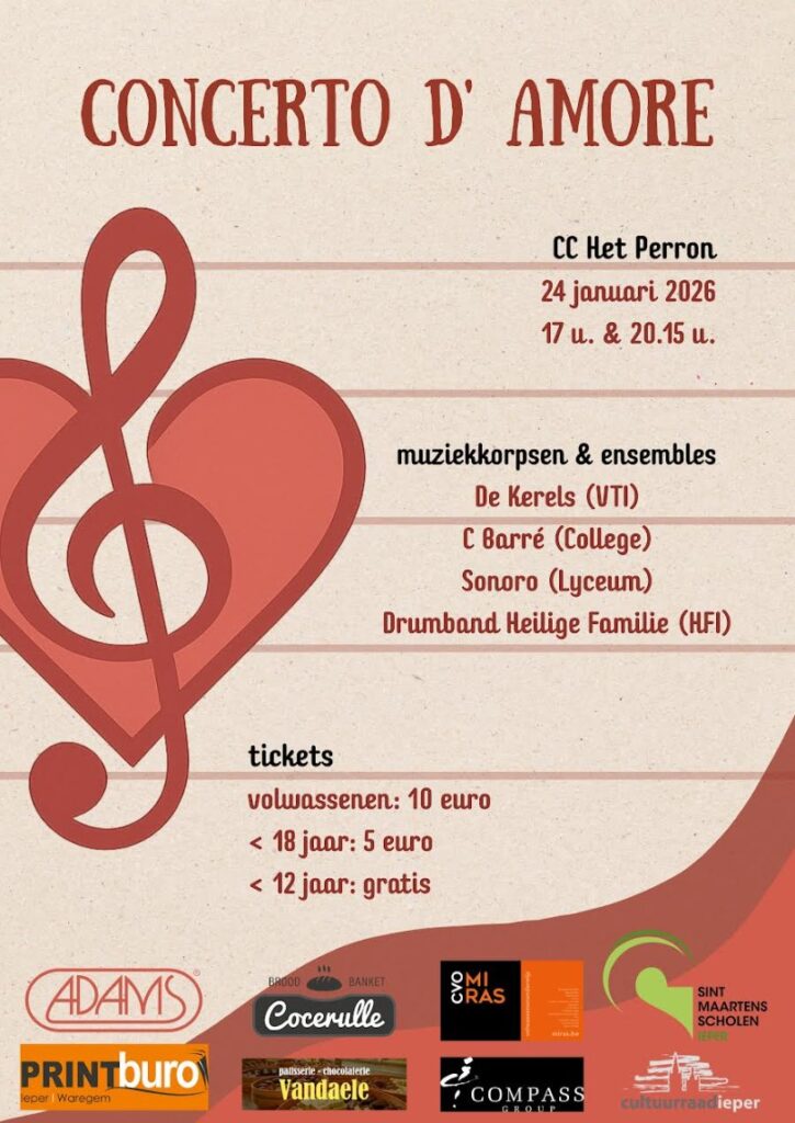 De Sint-Maartensscholen Ieper organiseren op 24 januari 2026 het Concerto d’Amore in Cultuurcentrum Het Perron een gezamenlijk optreden van de Koninklijke Harmonie De Kerels (VTI), Drumband Heilige Familie, C Barré (College) en ons eigen schoolorkest Sonoro. Het concert belooft een hartverwarmende ode aan muziek en liefde, zonder clichés zoals kaarsen en rozen. Dit wordt een ideale gelegenheid om al vóór Valentijn in een romantische stemming te komen. Hartelijk welkom om onze leerlingen te zien schitteren!